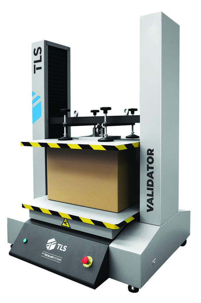 The testing instrument applies a specific load to the upper area of a corrugated box to determine the strength of the carton.