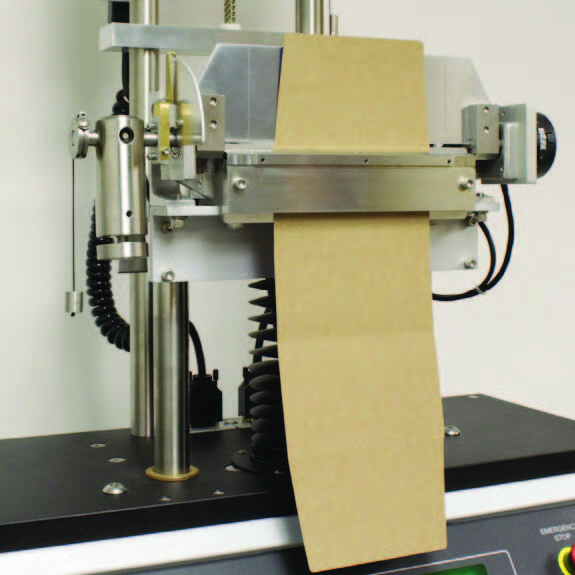 A score bend test measures the force needed to open or bend a scored corrugated carton.